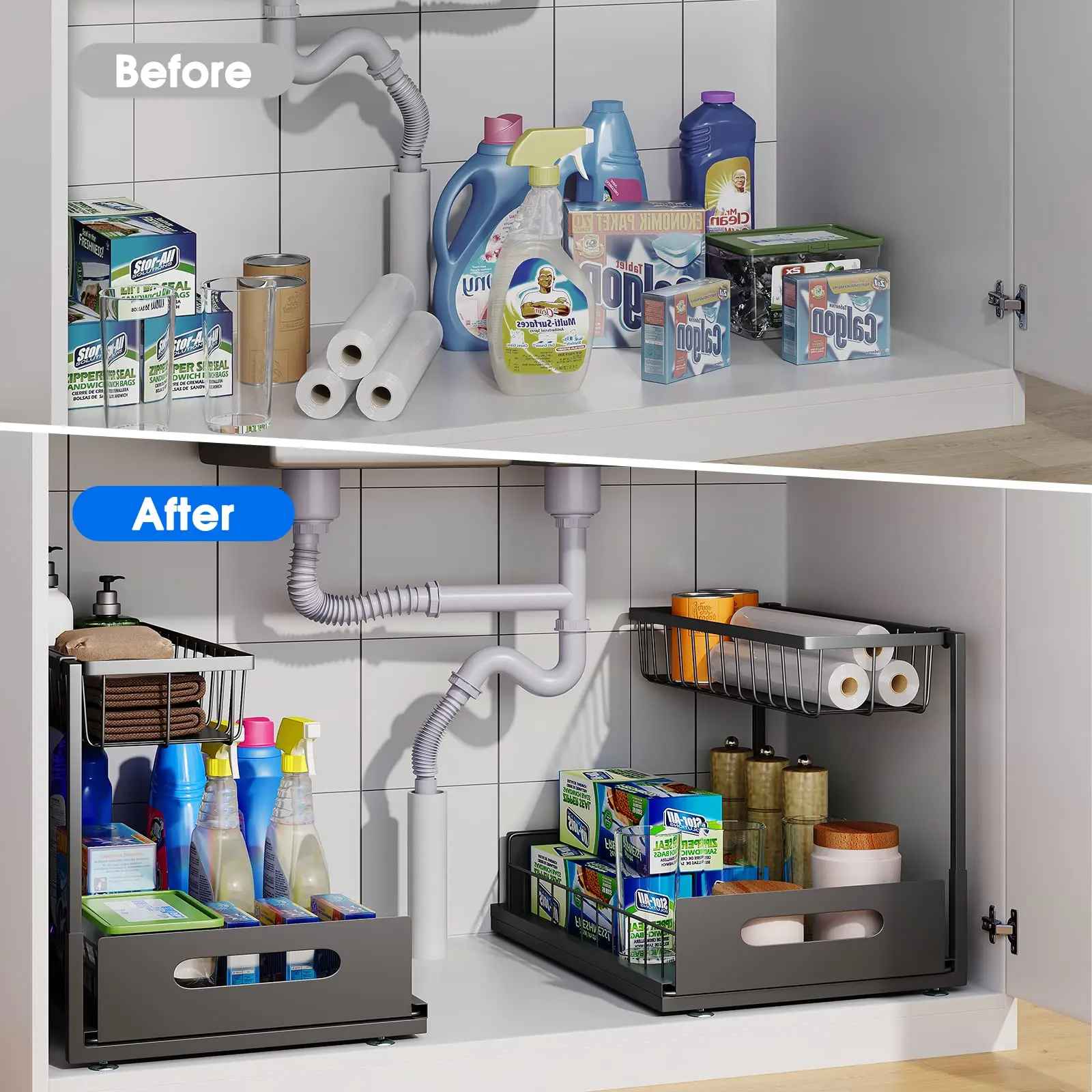 يحتوي على سلة سفلية منزلقة لسهولة الوصول إلى أدوات التنظيف والمواد الأساسية، بالإضافة إلى رف علوي قابل للإزالة يمنحك حرية الترتيب حسب احتياجاتك